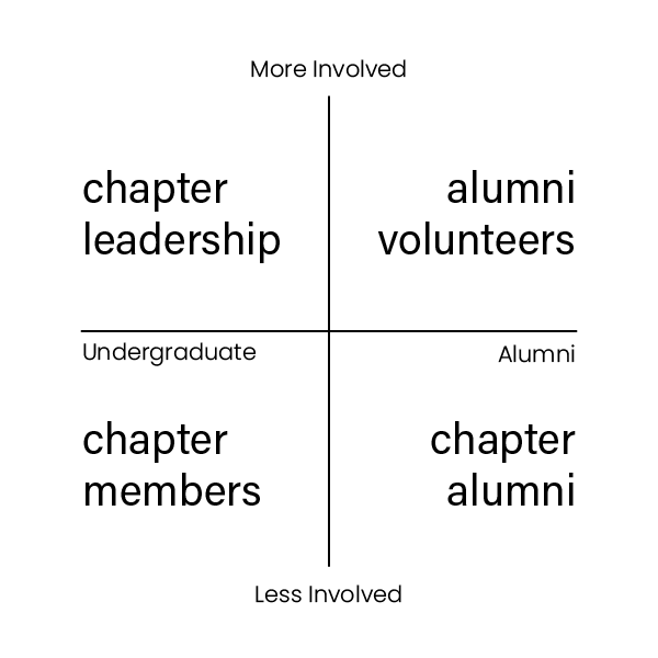 AEPi’s market was broken into four distinct segments, based on their status as a graduate or undergraduate member and involvement level within the fraternity. While the undergraduate segments are practically all males aged 18 to 22, alumni members are post-college males aged 22 to 99+. Naturally, alumni have a wider variance in their interests, life paths, etc.