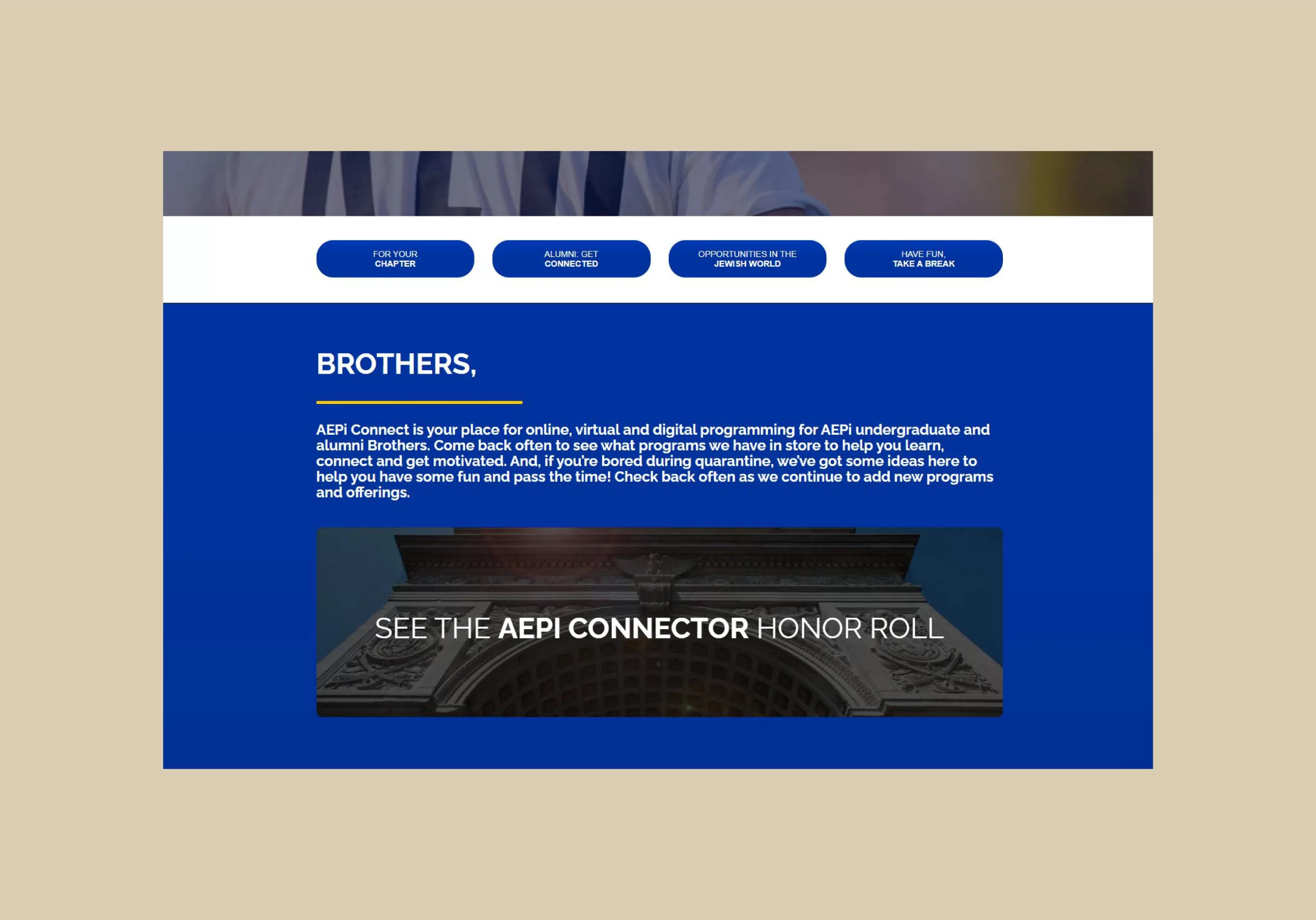 AEPiConnect was a project I completed while working as an in-house communication and graphic design professional for Alpha Epsilon Pi (AEPi), a historically Jewish social fraternity for men, with more than 170 chapters around the world.