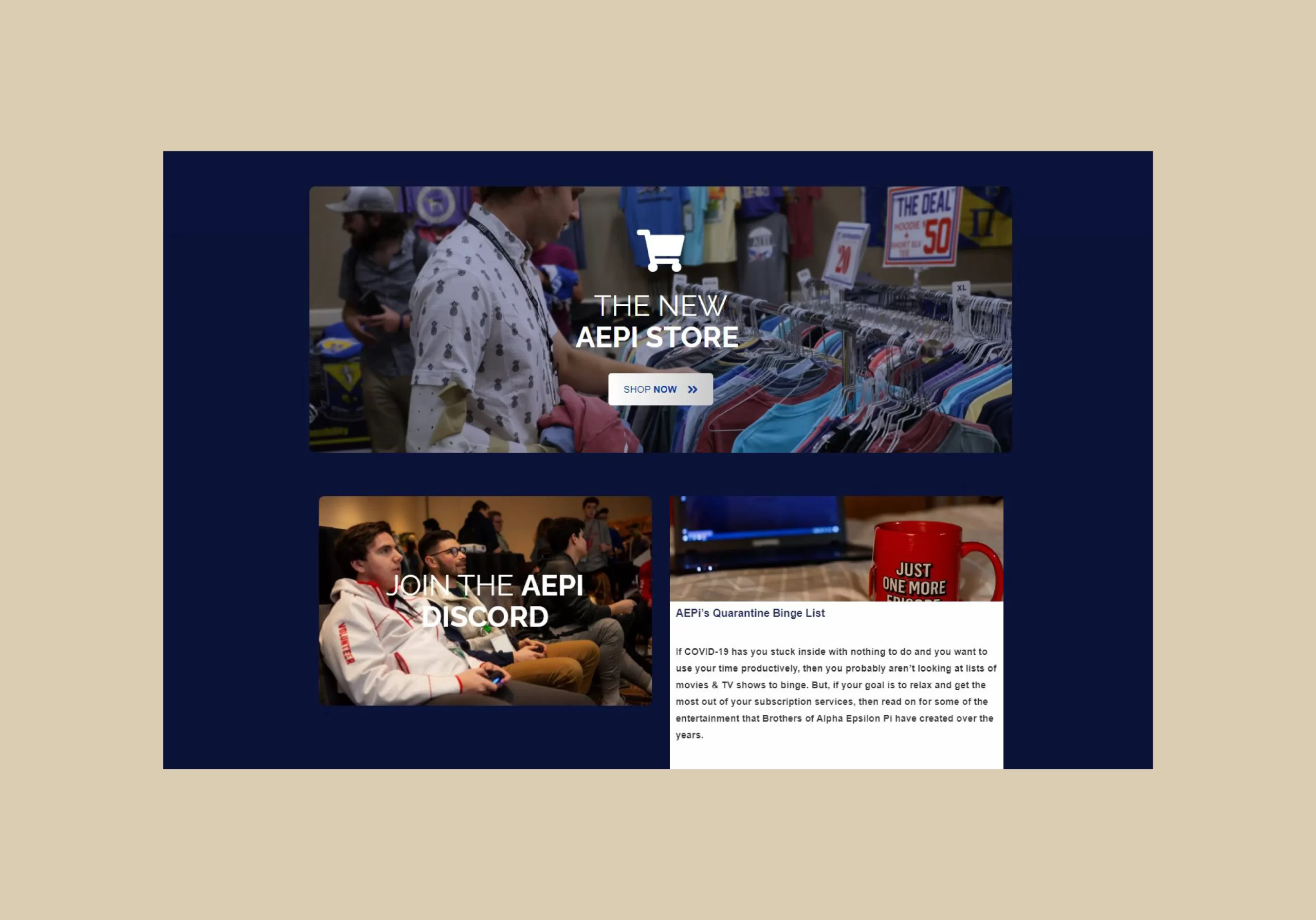 The visual approach emphasized the colors and typefaces that were an existing part of AEPI’s brand. Using blue as a background color allowed a departure from the white screens our members were looking at all day on Zoom calls and in online classes.
